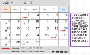 ー 12月おしらせ ー こんにちは😊 12月のカレンダーができました。 ☆2日(火) 午前休診 ☆20日(土)・26日(金)午後休診 ☆9日(火)休診 ~年末年始の休診日~ ☆12/30(火)~1/4(日) 皆さまのご来院スタッフ一同お待ちしております😄